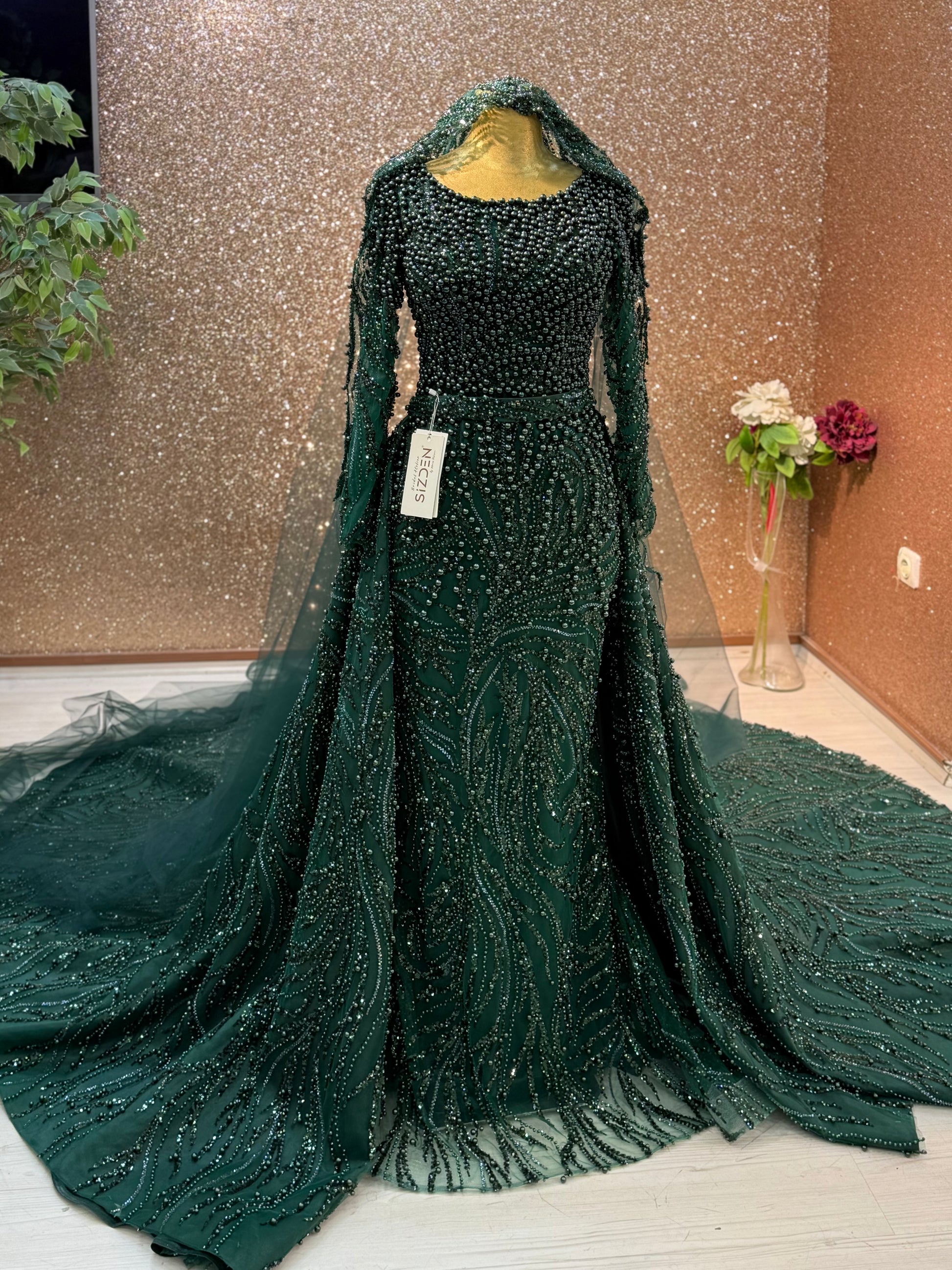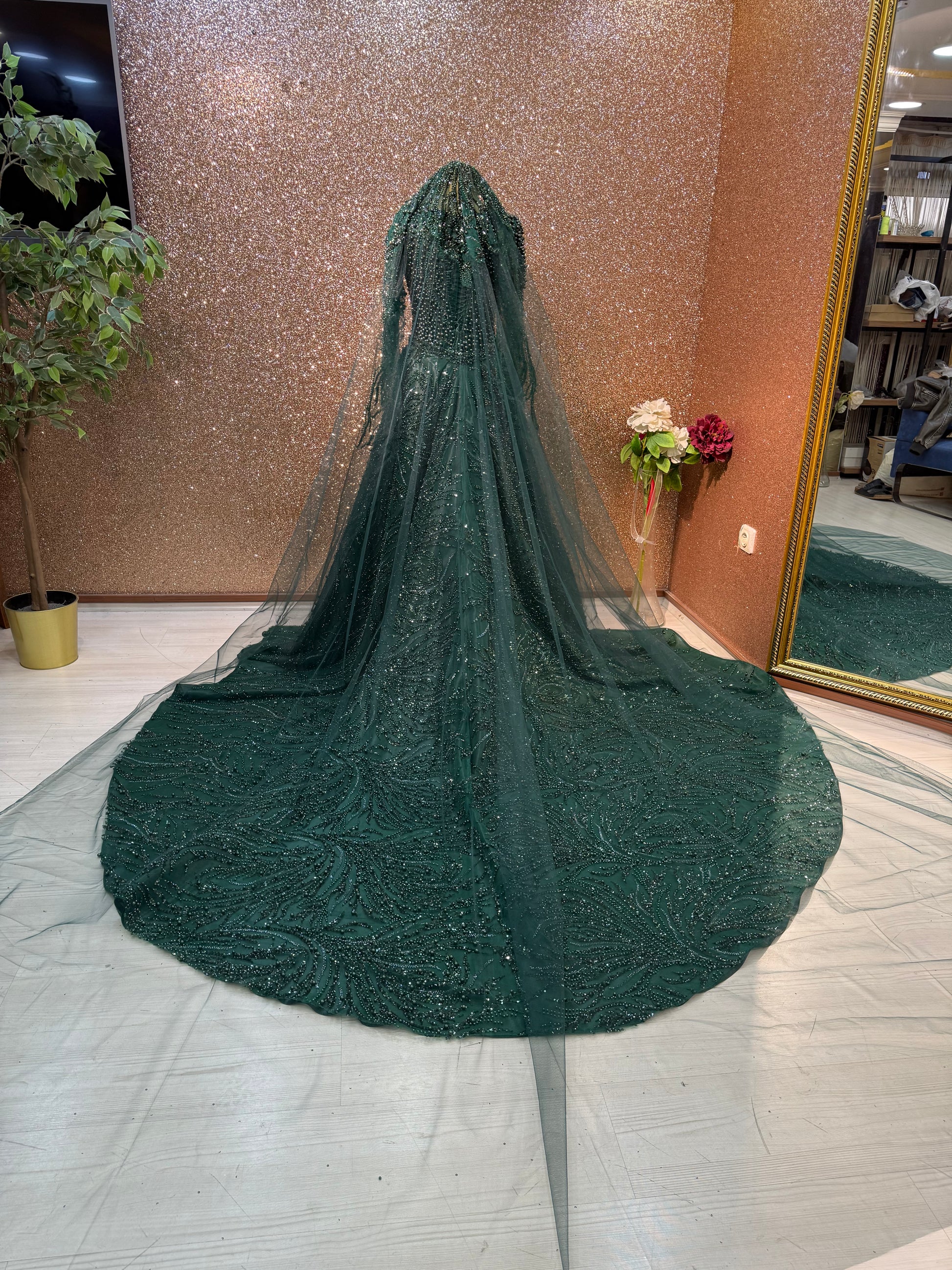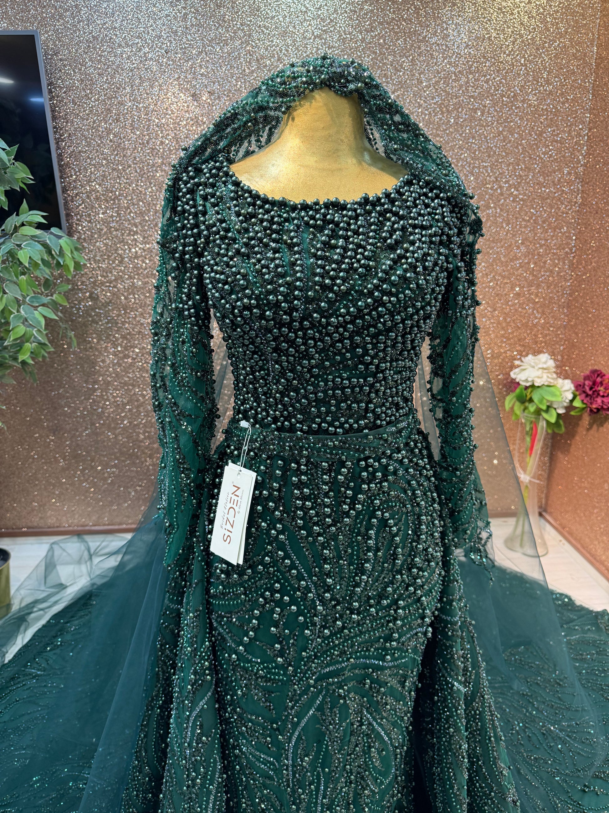 ✨ Emerald Green Lace Fitted Gown with Pearl Details ✨